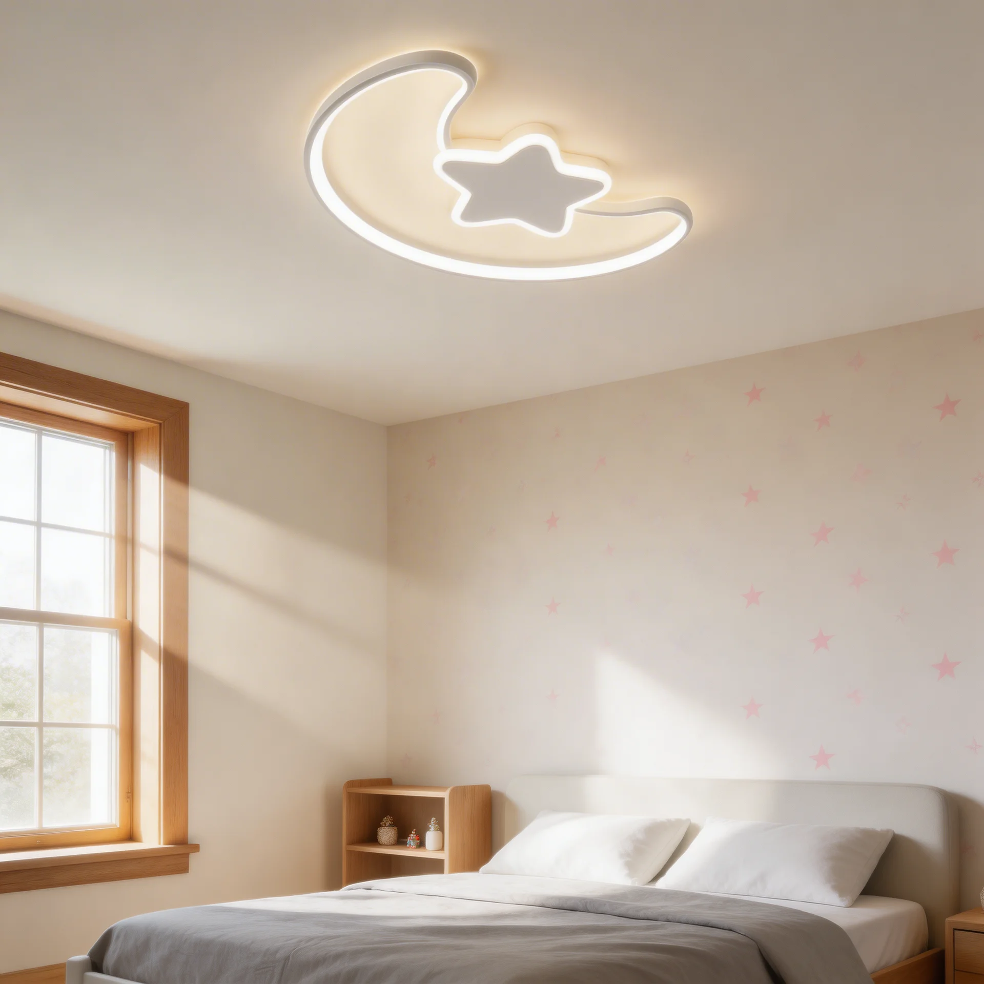 Stwórz nad głową swojego dziecka prawdziwe nocne niebo! Lampuś – Księżyc to nowoczesny, designerski plafon w kształcie księżyca i gwiazdy, który zamieni zwykły sufit w magiczne widowisko. Dzięki imponującej mocy 5200 lumenów i płynnej regulacji, jest to jedyna lampa, jakiej potrzebujesz – od jasnego światła do zabawy, po delikatny półmrok ułatwiający zasypianie.